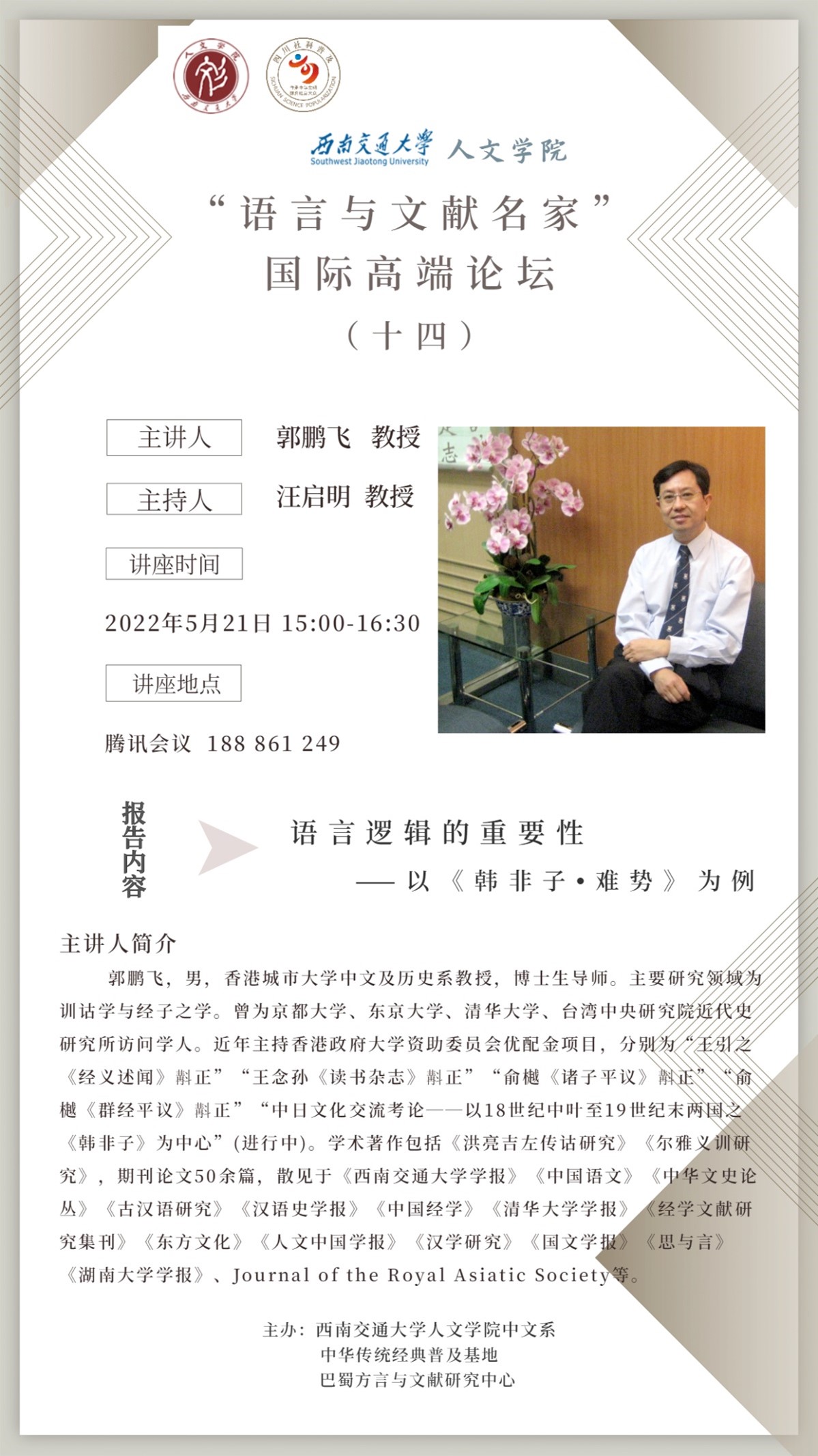 郭鹏飞,男,香港城市大学中文及历史系教授,博士生导师。主要研究领域为训诂学与经子之学。曾为京都大学、东京大学、清华大学、台湾中央研究院近代史研究所访问学人。近年主持香港特区政府大学资助委员会优配金项目,分别为“王引之《经义述闻》斠正”“王念孙《读书杂志》斠正”“俞樾《诸子平议》斠正”“俞樾《群经平议》斠正”“中日文化交流考论──以18世纪中叶至19世纪末两国之《韩非子》为中心”(进行中)。学术著作包括《洪亮吉左传诂研究》《尔雅义训研究》,期刊论文50余篇,散见于《西南交通大学学报》《中国语文》《中华文史论丛》《古汉语研究》《汉语史学报》《中国经学》《清华大学学报》《经学文献研究集刊》《东方文化》《人文中国学报》《汉学研究》《国文学报》《思与言》《湖南大学学报》、Journal of the Royal Asiatic Society等。
