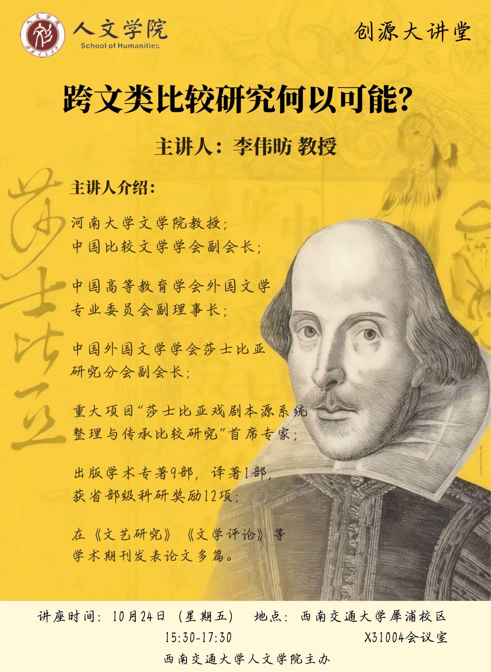 主讲人简介:河南大学文学院教授,河南大学中国语言文学博士点一级学科带头人,《河南大学学报》编辑部主任、主编。全国优秀博士学位论文奖获得者,教育部中文教学指导委员会委员,国家教材委员会学科专家组成员,国家社科基金评审专家,剑桥大学、哈佛大学访问学者,中国比较文学学会副会长,中国外国文学学会莎士比亚研究分会副会长,中国高等教育学会外国文学专业委员会副理事长,河南省外国文学与比较文学学会会长,主持完成3项国家社科基金项目(含重点1项),国家社科基金重大项目“莎士比亚戏剧本源系统整理与传承比较研究”首席专家,出版学术专著9部,译著1部,主编教材多部,获省部级科研奖励12项,在《中国社会科学》《文学评论》《外国文学评论》《文艺研究》等学术期刊发表论文多篇。