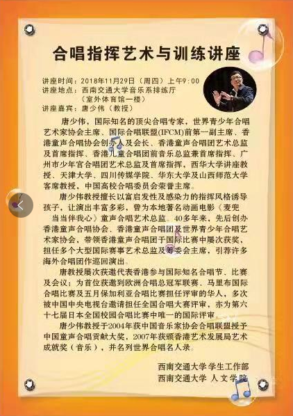 讲座地点:西南交通大学音乐系排练厅(室外体育馆一楼)