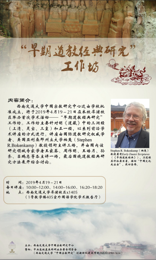 西南交通大学中国宗教研究中心近由学校批准成立,并将于2019年4月19-21日在本校犀浦校区举办首次学术活动——“早期道教经典研究” 工作坊。工作坊主要针对明《道藏》中的三洞经(上清、灵宝、三皇)和正一经,以系列前沿学术讲座的方式进行。讲座由国际道教研究权威学者、美国亚利桑那州立大学柏夷(Stephen R. Bokenkamp)教授领衔主讲三场,并由国内该研究领域专家学者王家葵、周作明、王皓月、孙齐、吕鹏志等各主讲一场,最后是集体综合讨论和发言。