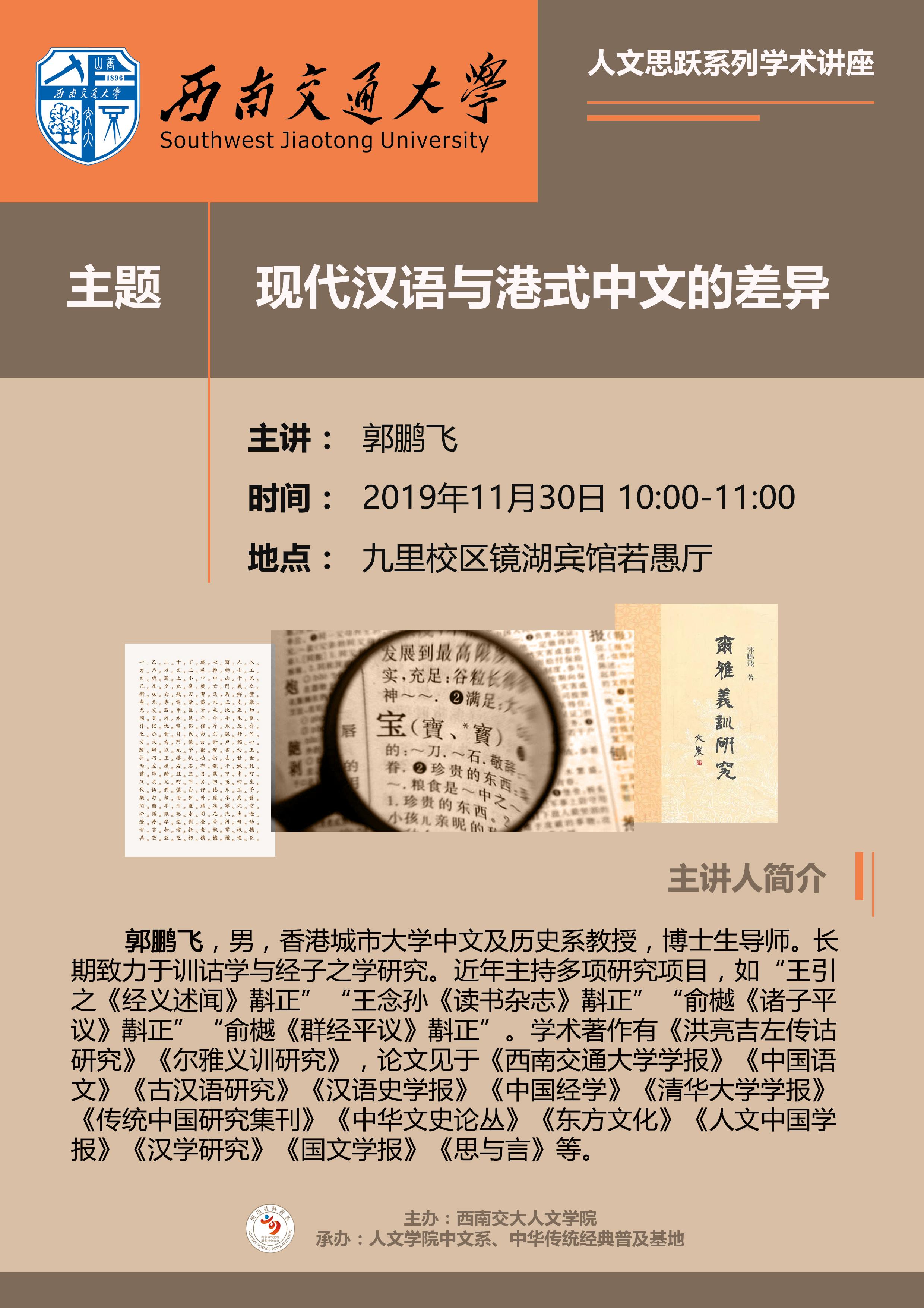郭鹏飞,香港城市大学中文及历史系教授,博士生导师。长期致力于训诂学与经子之学研究。近年主持多项研究项目,如“王引之《经义述闻》斠正”“王念孙《读书杂志》斠正”“俞樾《诸子平议》斠正”“俞樾《群经平议》斠正”。学术著作有《洪亮吉左传诂研究》《尔雅义训研究》,论文见于《西南交通大学学报》《中国语文》《古汉语研究》《汉语史学报》《中国经学》《清华大学学报》《传统中国研究集刊》《中华文史论丛》《东方文化》《人文中国学报》《汉学研究》《国文学报》《思与言》等。