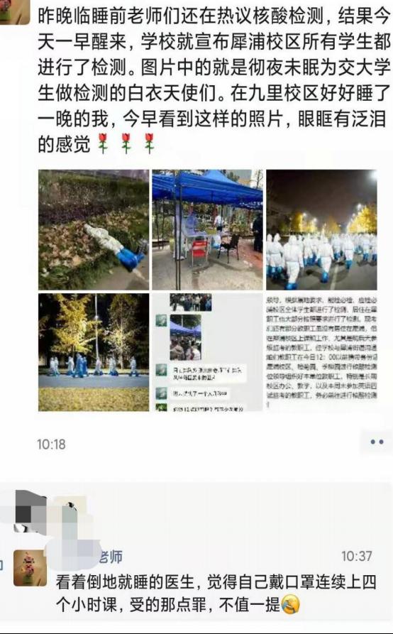 The College of Humanities has a warm heart. We should pay tribute to the medical staff in white, to the teachers and students who did nucleic acid testing in a serious and orderly way that night.